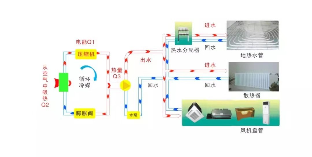 空氣能供暖設備是一種利用空氣中的低品位熱量進行加熱的設備。其工作原理是通過壓縮機將低溫低壓的制冷劑壓縮成高溫高壓的氣體,然后通過換熱器將其釋放出來,使其與外界的空氣進行熱交換,從而實現加熱的目的。