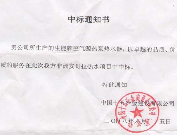 湖北黃石,中國十五冶金集團在6月12日公開招標首批援非熱泵熱水器項目,要求生產廠家擁有生產許可證,檢測報告以及相關資質證書,并且環境干球溫度20℃,濕球溫度15℃,COP值達到3.8以上。生能空氣源熱水器以優良的品質,良好的服務順利擊敗國內同行業其他幾家較著名品牌,競標成功,成為國內第一家打進南非安哥拉市場的熱泵生產廠家。