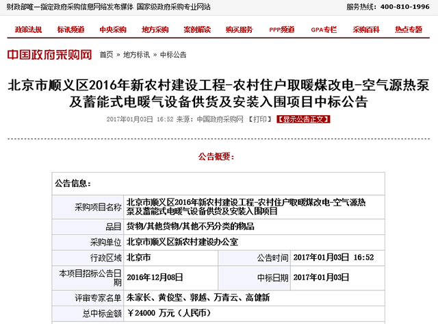 2017年1月3日,中國政府采購網公布了“北京市順義區2016年新農村建設工程-農村住戶取暖煤改電-空氣源熱泵及蓄能式電暖氣設備供貨及安裝入圍項目”,生能空氣能再次中標,與其他入圍企業共同分羹2.4億市場。詳細內容見下: